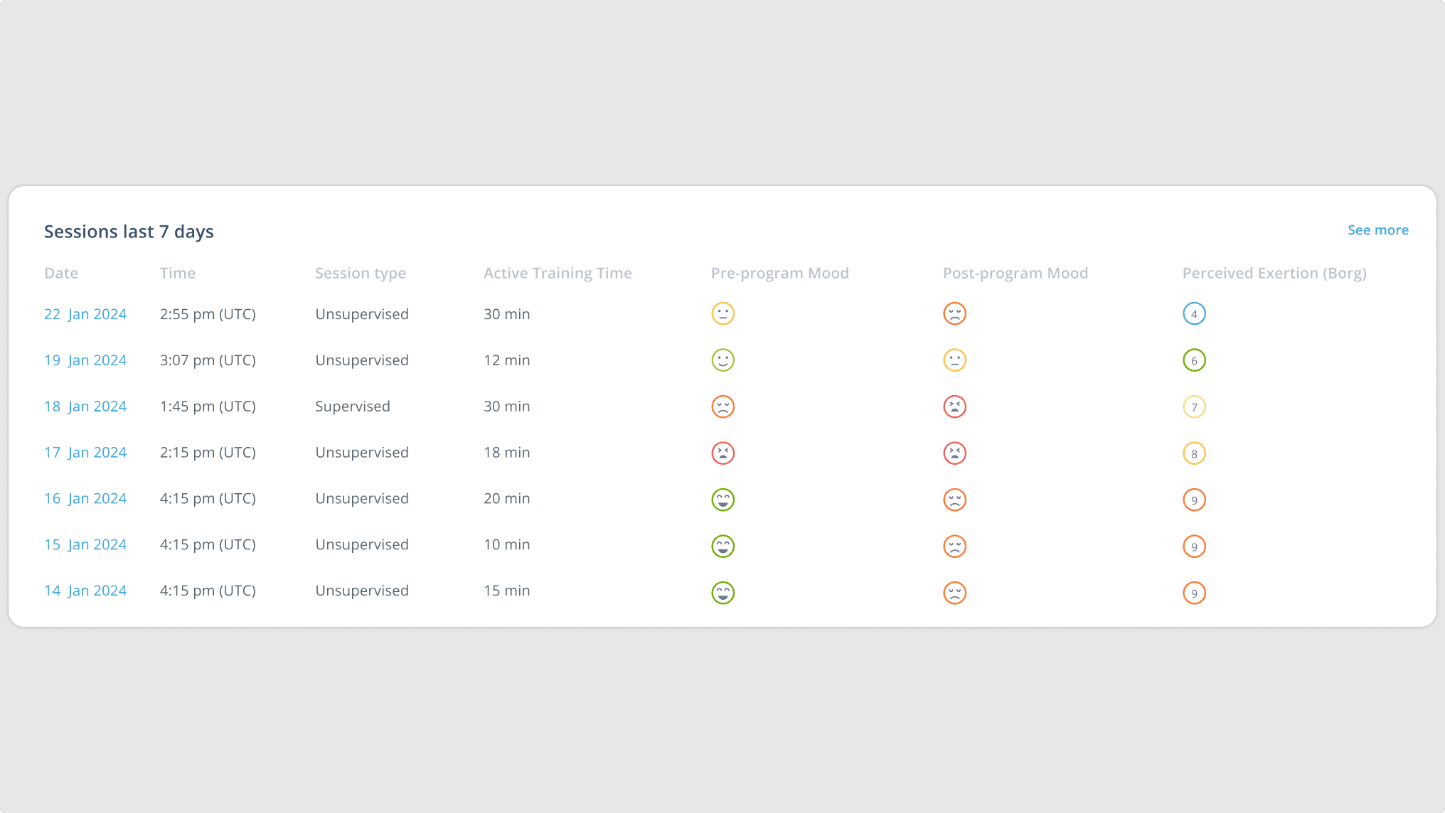 Highlights from the past week’s sessions are displayed here. Therapists can view session timing, type, duration, patient mood, and Borg exertion scale ratings